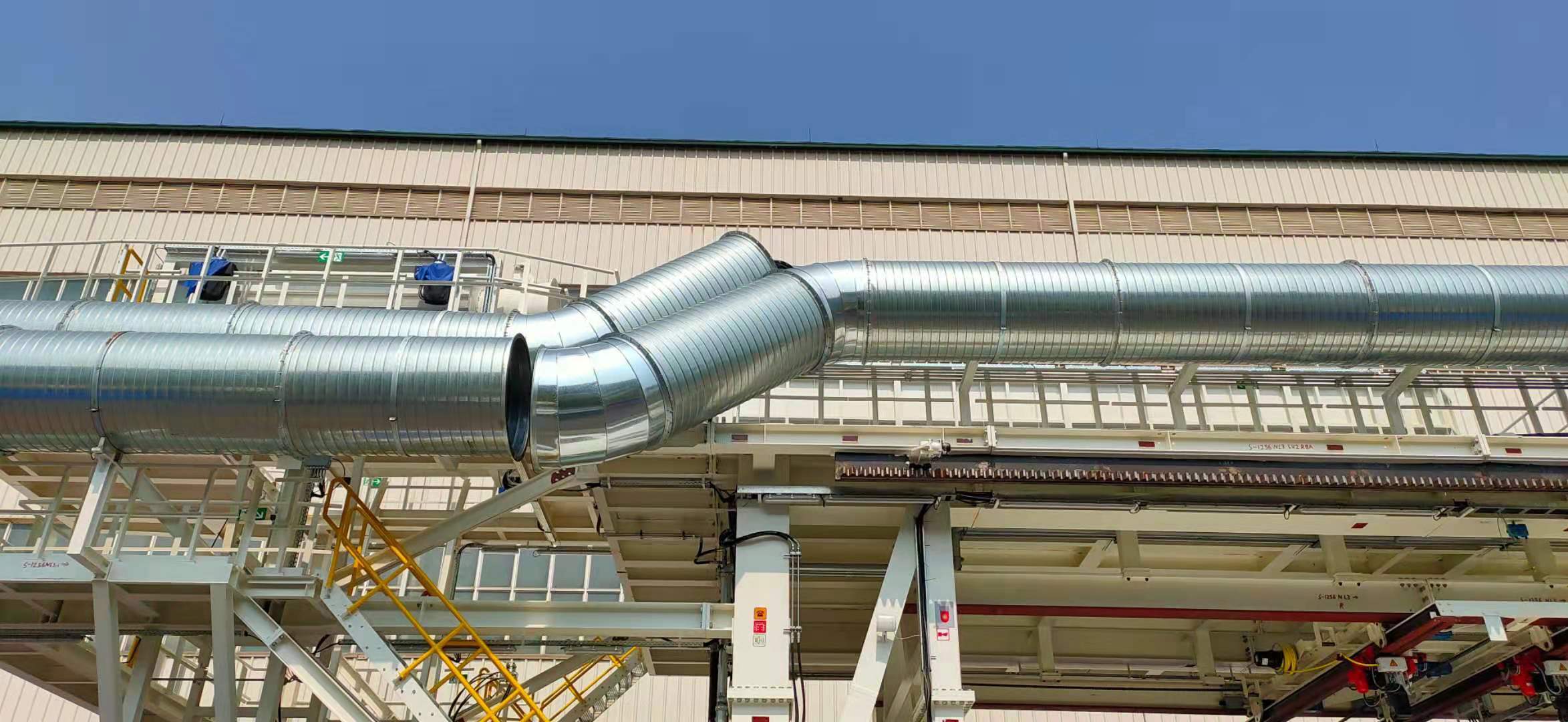 觀察現場的施工情況,因為現場施工情況不一樣的話,連接的長度也是不一樣的,所以我們先要將螺旋風管一節一節的放在支架上銜接起來,這是最開始的步驟。